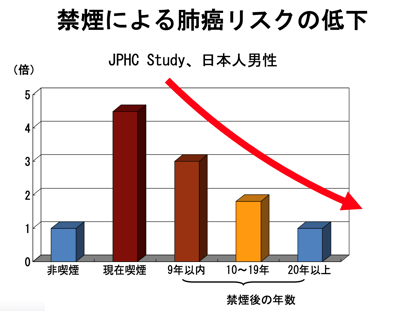 おおよそ禁煙して20年間経つと、非喫煙者と肺癌の危険性は変わらなくなります。肺癌に限らず、禁煙するだけで肺機能の低下が抑えられることもわかっています。禁煙は早い方がいいですが、何歳になって始めても効果があります。